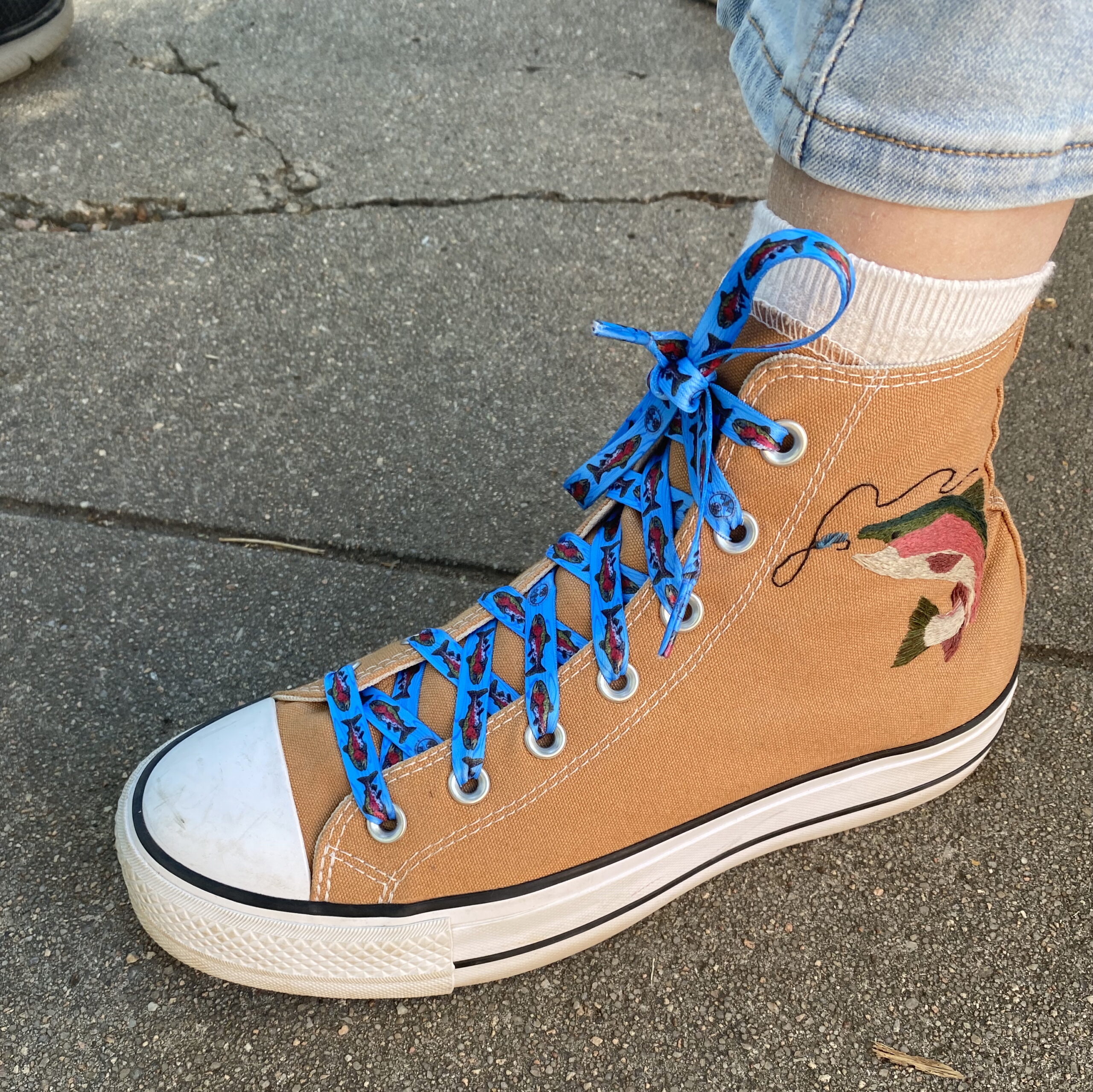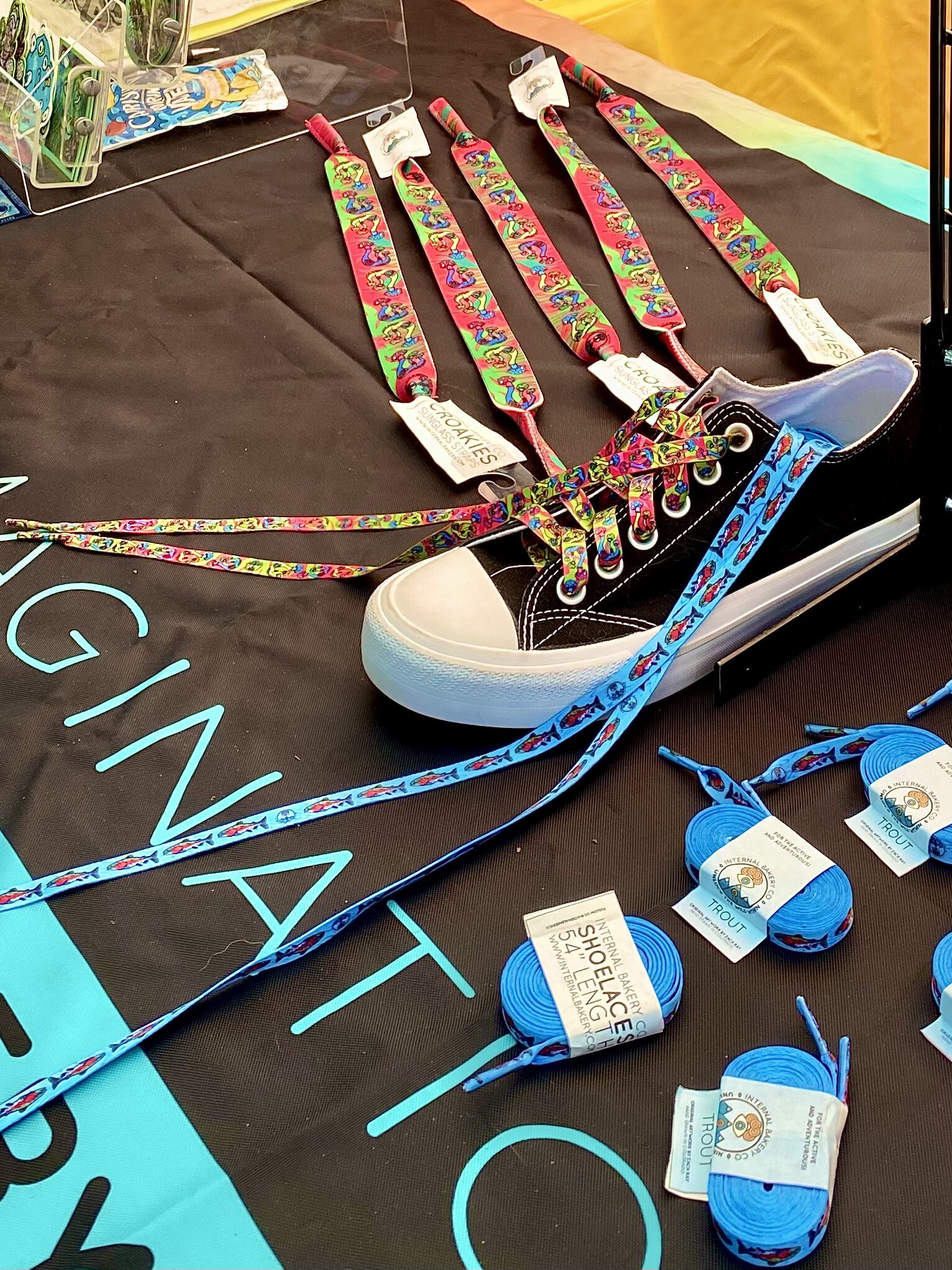 Step into imagination with the Lookout Trout Shoelaces — a splash of creativity for your kicks! These 54″ laces feature a bright blue base with trout swimming across, each one detailed with Internal Bakery logos that bring the design to life.